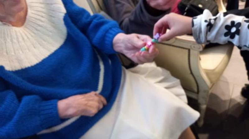 Les enfants avaient également prévu des petits cadeaux pour des résidentes. Ils avaient mené des bracelets de perles colorées qu'ils avaient créés au Centre aéré. Les bracelets ont été offerts par les enfants avant de partir, au grand bonheur des résidentes !