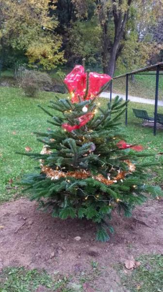 Le traditionnel sapin trônant à l'accueil du haut de ses 3 mètres, et 10 petits sapins qui vont agrémenter l'extérieur pour réaliser notre jardin de Noël.